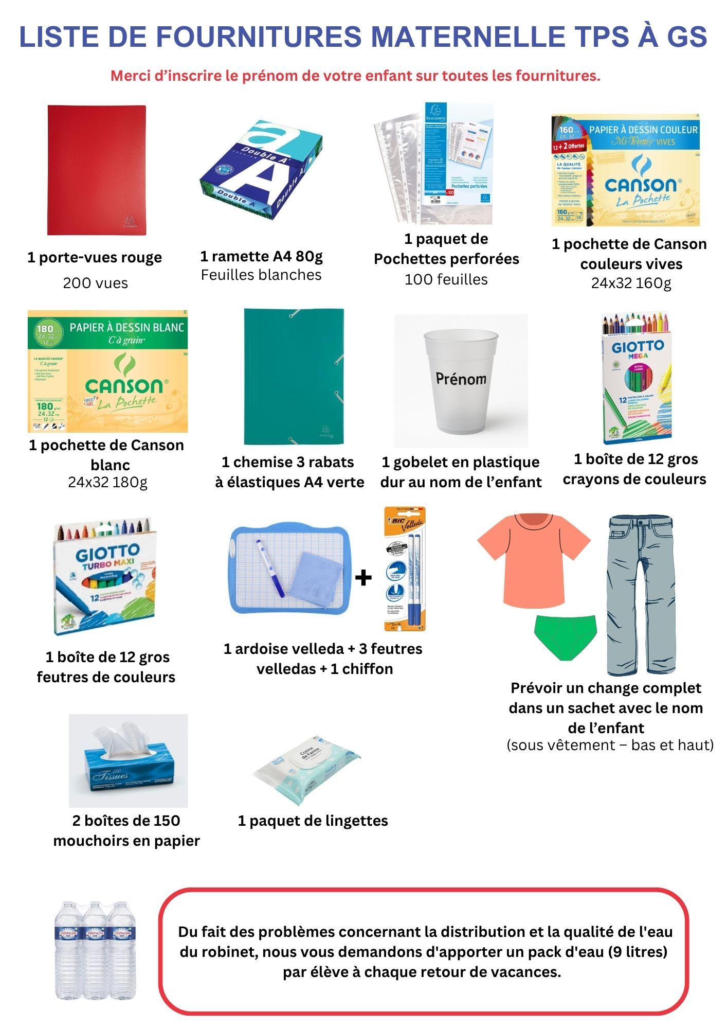 Du fait des problèmes concernant la distribution et la qualité de l'eau du robinet, nous vous demandons d'apporter un pack d'eau (9 litres) par élève à chaque retour de vacances.